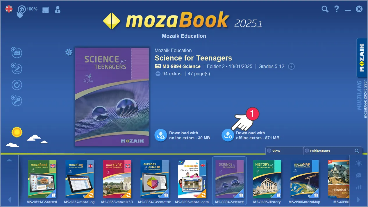 ΣτοmozaBookέχουμε δυνατότητα να κατεβάσουμε τα βιβλία μας online και offline. Η επιλογή offline απαιτεί πάντα περισσότερο χώρο στον σκληρό δίσκο, αλλά μπορούμε μετά την λήψη να ανοίξουμε τα βιβλία μας και να χρησιμοποιήσουμε το διαδραστικό περιεχόμενο (σκηνές 3D, βίντεο, ασκήσεις) ακόμα και χωρίς ενεργή σύνδεση με το διαδίκτυο.
