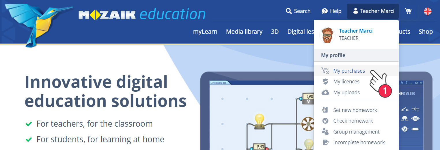 Μόλις συνδεθείς, θα βρεις τα είδη που αγόρασες από το μενού που ανοίγει με κλικ στο όνομά σου στο σημείο "Οι αγορές μου" (1).