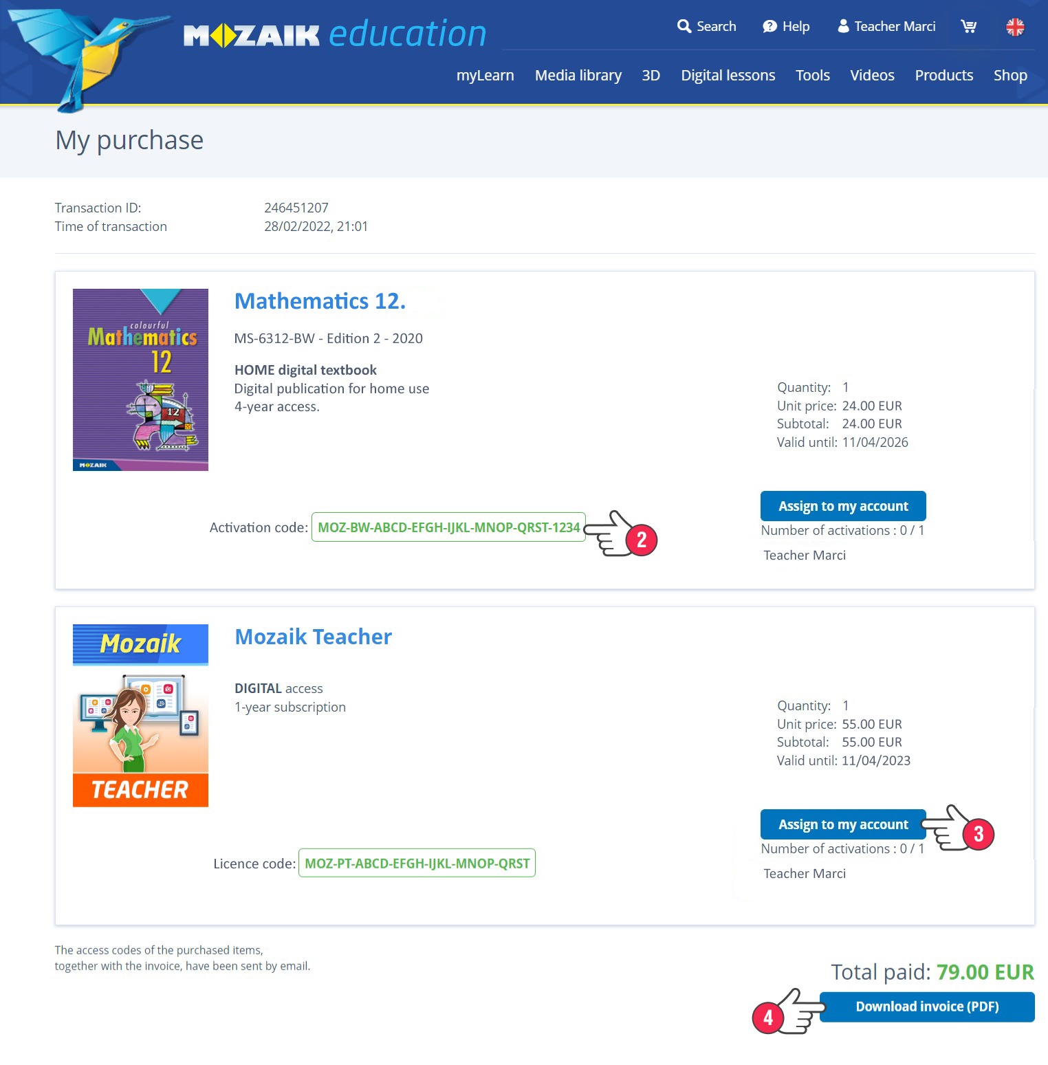 Στη σελίδα αυτή θα βρεις τον κωδικό ενεργοποίησης ή άδειας χρήσης των ειδών που αγόρασες (2). Εδώ μπορείς, αμέσως, με ένα κλικ, να ενεργοποιήσεις τα ψηφιακά βιβλία και την άδεια χρήσης mozaWeb PREMIUM, δηλαδή να τα συνδέσεις/συσχετίσεις με τον λογαριασμό σου (3). Μπορείς να κατεβάσεις και το ηλεκτρονικό αντίγραφο του τιμολογίου αγορών σου (4).