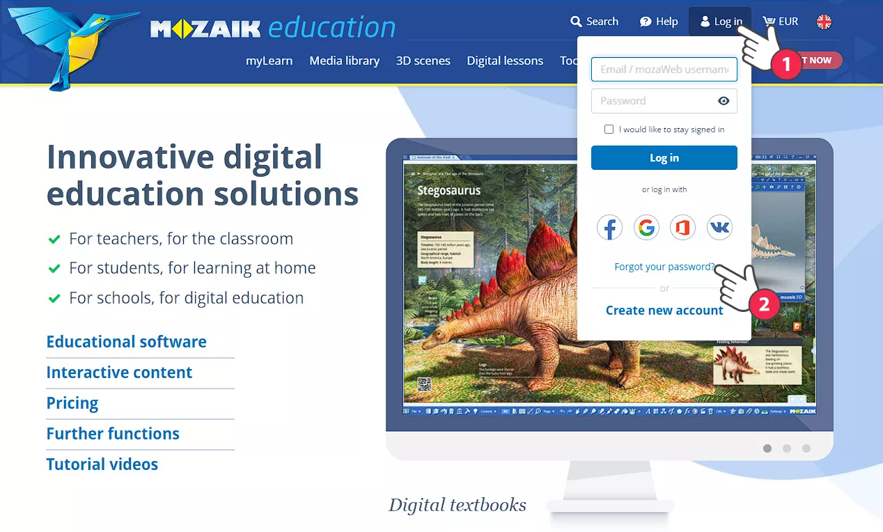 Αν ξέχασες τον κωδικό σου, έχεις την δυνατότητα να ρυθμίσεις νέο κωδικό πρόσβασης. Από την κεφαλίδα της σελίδας άνοιξε το παράθυρο εισόδου (1) και επέλεξε την Υπενθύμιση κωδικού (2):