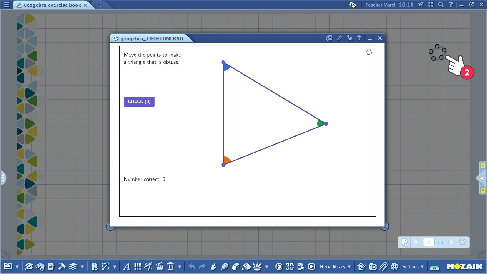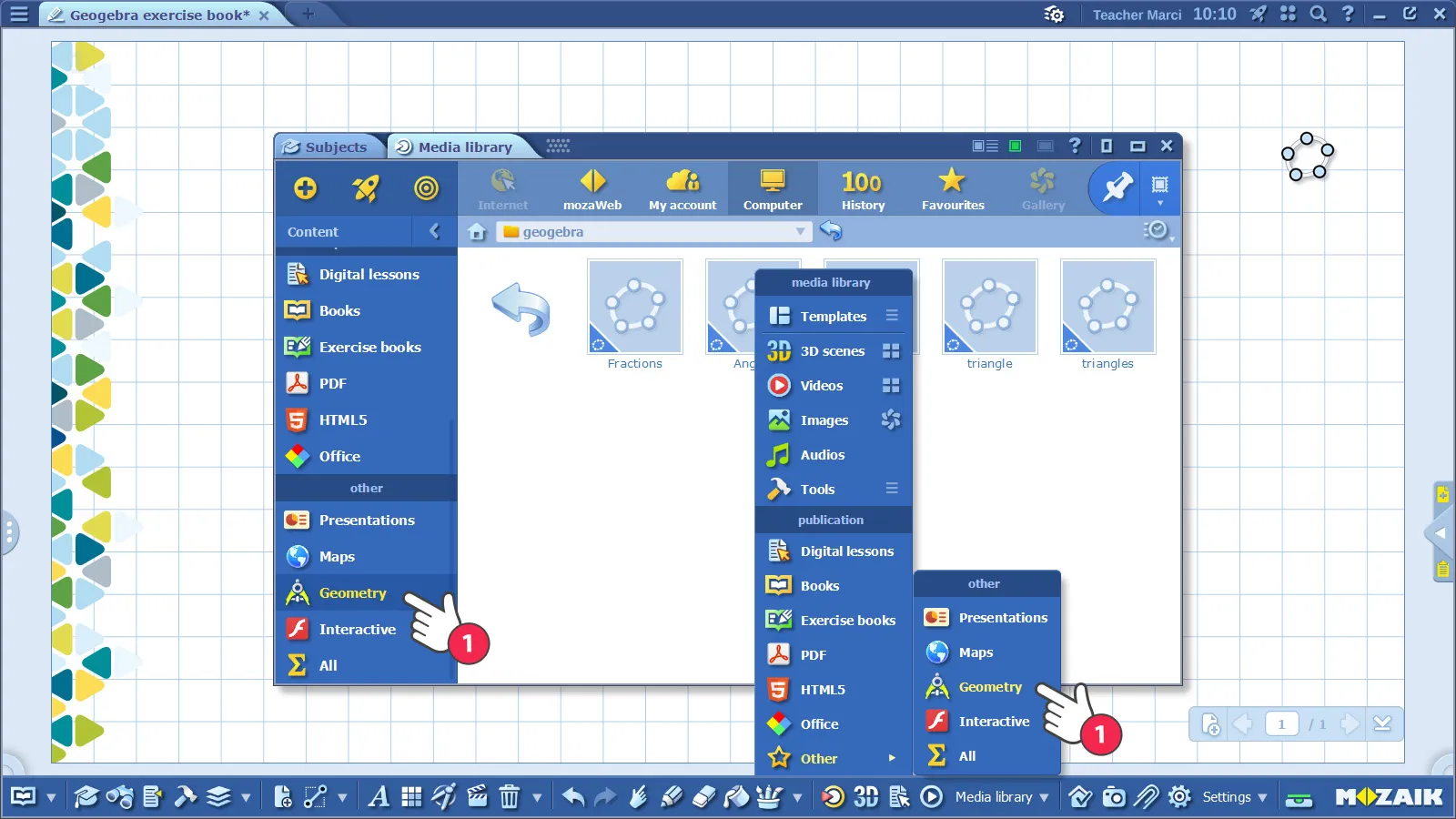 You can open and use GeoGebra content in mozaBook. The extension of GeoGebra files is .ggb. You can find these in the Geometry menu of the Media library (1).