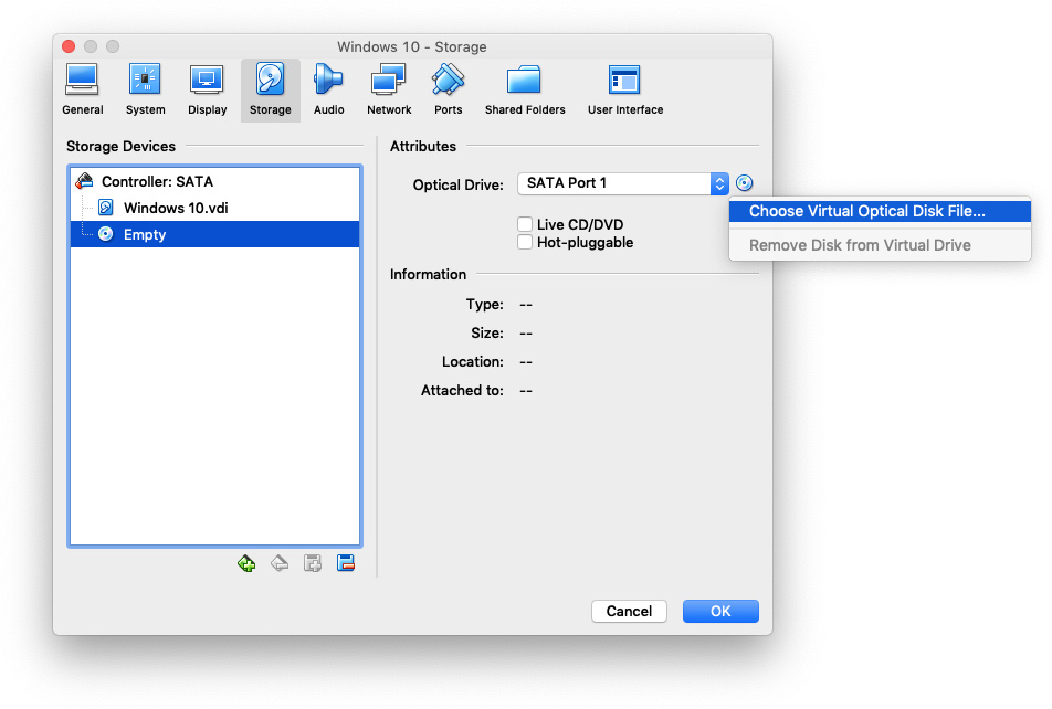 Κατόπιν, με κλικ στο εικονίδιο Ρυθμίσεις κάνουμε τις υπόλοιπες ρυθμίσεις του υπολογιστή μας. Από το μενού Οδηγοί επιλέγουμε τον άδειο οδηγό CD και με κλικ στο δεξιό εικονίδιο CD κάνουμε αναζήτηση του προγράμματος εγκατάστασης Windows 10 που προηγουμένως κατεβάσαμε από τον ιστότοπο της Microsoft.