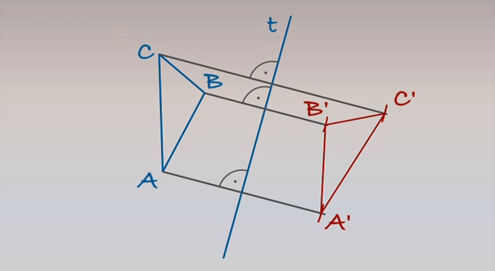 Με δεδομένα στο επίπεδο ένα τρίγωνο ΑΒC και μια ευθεία t, μπορούμε να κατασκευάσουμε το συμμετρικό του τριγώνου ΑΒC ως προς την ευθεία.